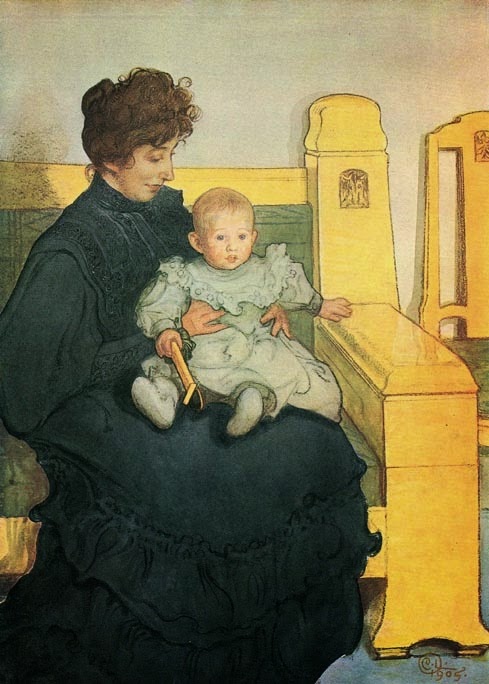 | Carl Larsson, Mrs Alma Theorell, 1909. The mature woman with the vibrancy of embroidered colors on her knee now her children are gown. |